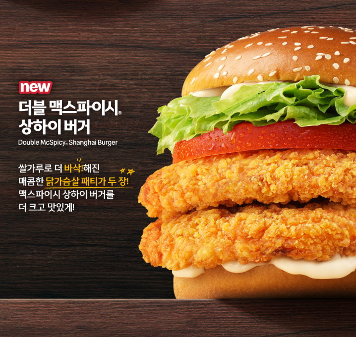 추천 이유: 스테디셀러 메뉴 1955버거의 업그레이드 버전! 풍미와 양 모두 만족 - 더블 맥스파이시® 상하이 버거