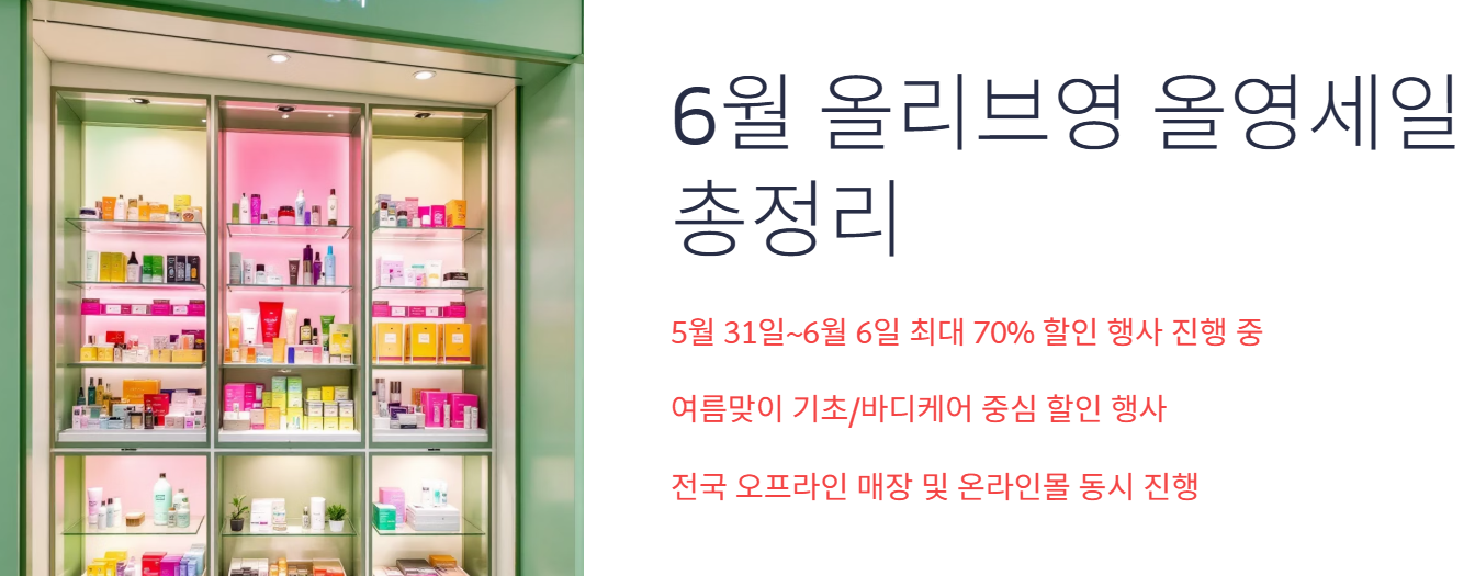 2025년 6월 올리브영 올영세일은 여름 시즌을 대비한 실속 아이템을 합리적인 가격에 장만할 수 있는 최고의 타이밍입니다.