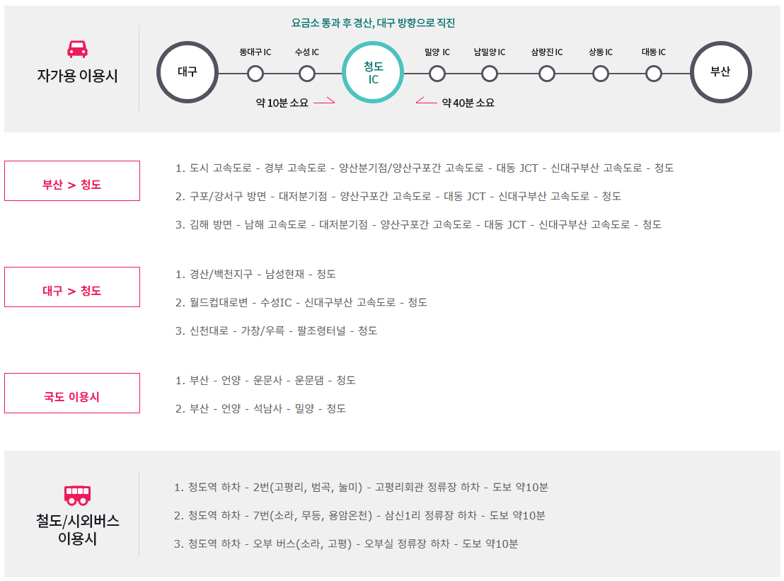 • 부산 → 청도: 신대구부산고속도로 이용, 약 1시간 20분
