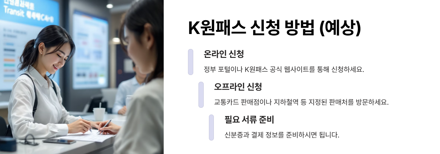 현재 K원패스는 공약 단계로, 도입 일정과 신청 방법은 아직 구체화되지 않았습니다. 하지만 정부는 해당 정책의 실현을 위해 준비 중이며, 조만간 발표가 있을 예정입니다.